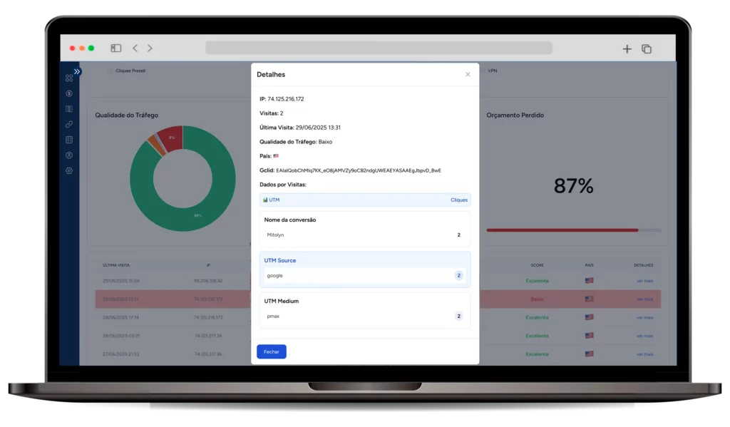 Ele detecta e bloqueia bots, visitas maliciosas e tráfego suspeito em tempo real, protegendo o seu investimento.